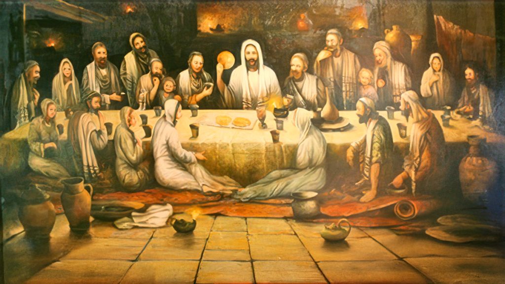The “Last Supper” by the Polish artist Bohdan Piasecki was painted in 1998, oil on canvas, in his studio in Warsaw. It shows Jesus and his 12 male apostles together with six women and two children reclining around a low table in Jerusalem to celebrate the Passover, eating Jewish food and wearing Jewish clothes.