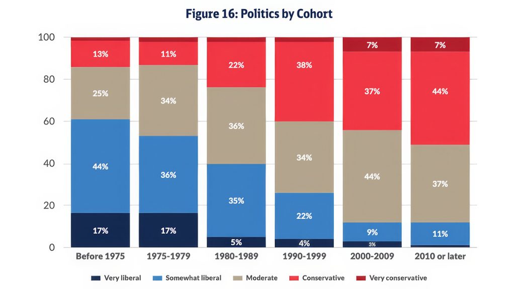 “Among those ordained before 1975, 61% identified as ‘very’ or ‘somewhat’ liberal and less than 15% as conservative,” the study reports. “Among those ordained since 2010, nearly half (51%) identified as ‘very’ or ‘somewhat’ conservative, and only about one in ten as liberal.”