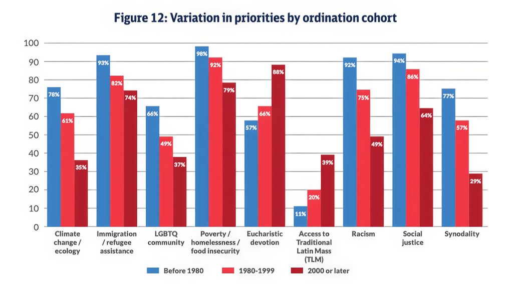 “On issues such as climate change, immigration, LGBTQ issues, poverty, racism, social justice, and synodality, prioritization diminishes as age goes down,” the report showed. “It is the opposite in the case of Eucharistic devotion and access to the TLM.”